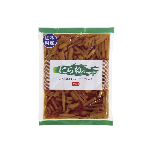 | 原材料 | にら(国産)、漬け原材料(しょうゆ、砂糖・ぶどう糖果糖液糖、醸造酢、発酵調味液、唐辛子)、調味料(アミノ酸等)、着色料(カラメル)、 酸化防止剤(ビタミンC)、(原材料の一部に小麦、大豆を含む) | ||