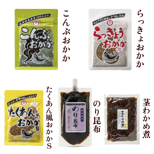 | 内容量 | たくあん風おかかS:70g、こんぶおかか:80g、らっきょうおかか:92g、のり昆布:120g、鳴門産茎わかめ煮:250g | ||